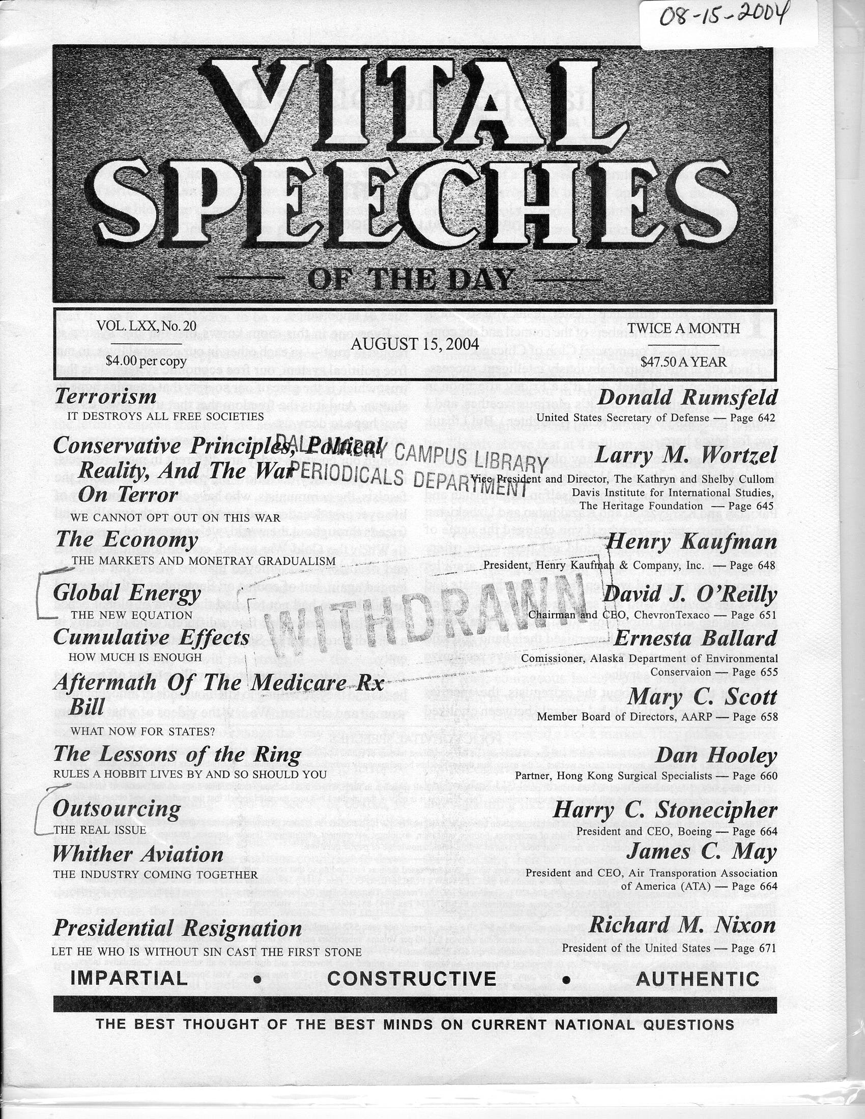 Speeches by Donald Rumsfeld, Larry M. Wortzel, Henry Kaufman, David J O'Reilly, Ernesta Ballard, Mary C Scott, Dan Hooley, Harry C Stonecipher, James C May, and Richard M Nixon (Presidential Resignation)