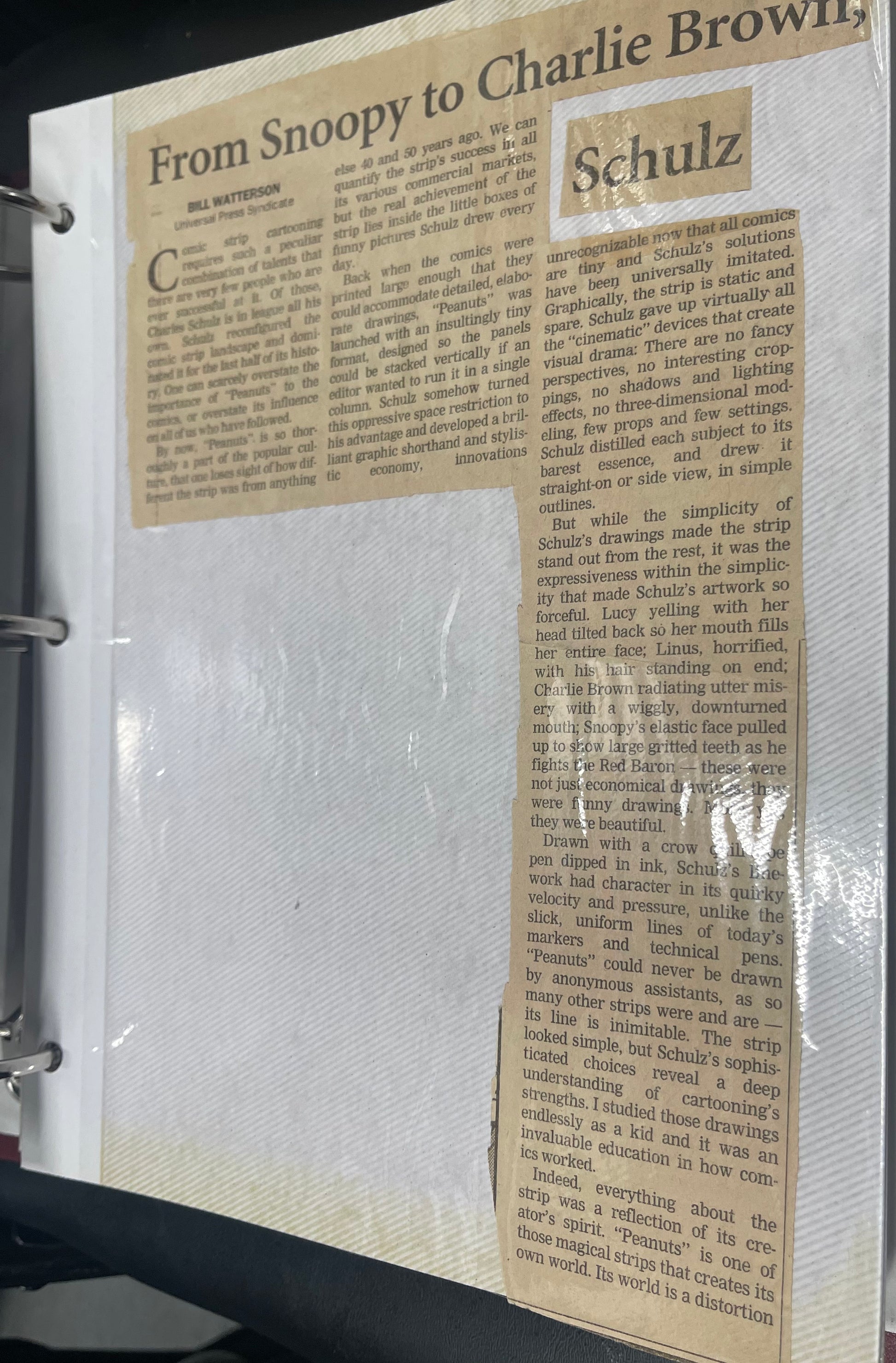 This vintage homemade Peanuts scrapbook contains over 50 pages of carefully assembled news clippings and comic strips by Charles Schulz, featuring iconic characters Charlie Brown and Snoopy. It offers a comprehensive collection that highlights the cultural impact and artistic evolution of the beloved Peanuts series. Perfect for serious collectors or scholars, this scrapbook provides valuable insight into the history and enduring charm of Schulz’s work.
